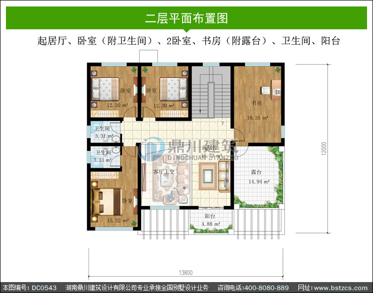 二 層: 起居廳、臥室(附衛(wèi)生間)、2臥室、書房(附露臺)、衛(wèi)生間、陽臺