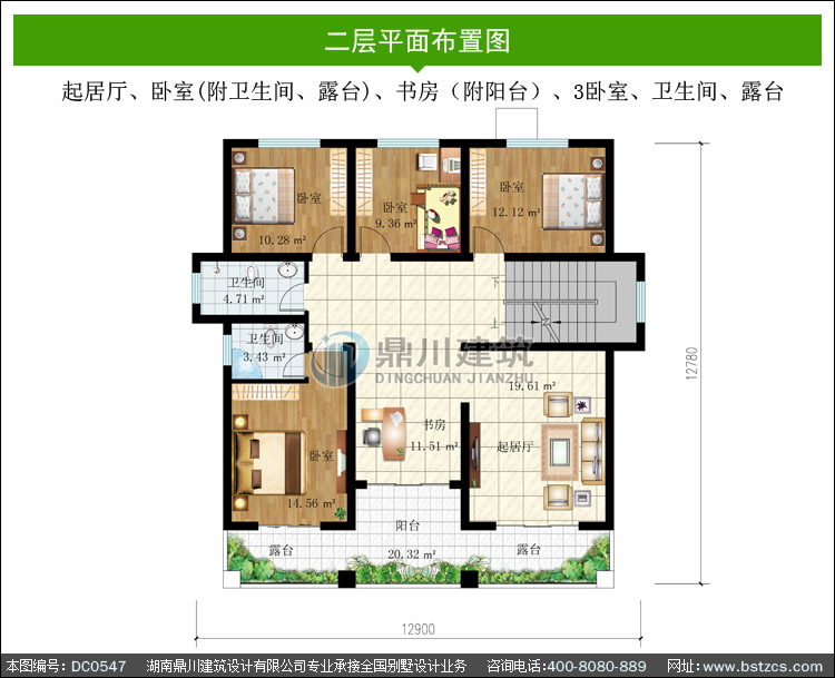 | 二 層: | 起居廳、臥室(附衛(wèi)生間、露臺(tái))、書房(附陽臺(tái))、3臥室、衛(wèi)生間、露臺(tái) | |||