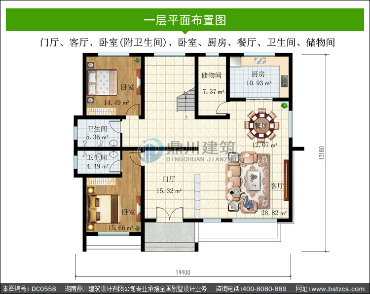| 一 層: | 門廳、客廳、臥室(附衛(wèi)生間)、臥室、廚房、餐廳、衛(wèi)生間、儲(chǔ)物間 | |||