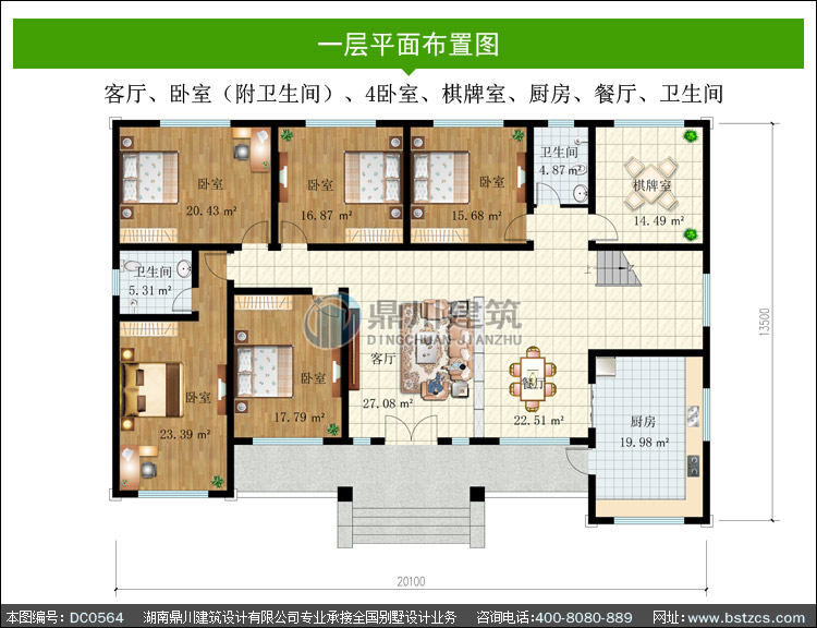 | 一 層: | 客廳、臥室(附衛(wèi)生間)、4臥室、棋牌室、廚房、餐廳、衛(wèi)生間 | |||