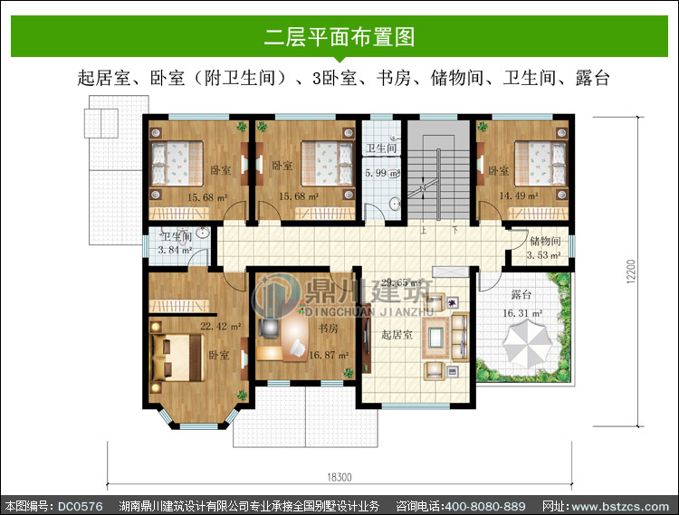 | 二 層: | 起居室、臥室(附衛(wèi)生間)、3臥室、書房、儲物間、衛(wèi)生間、露臺 | |||