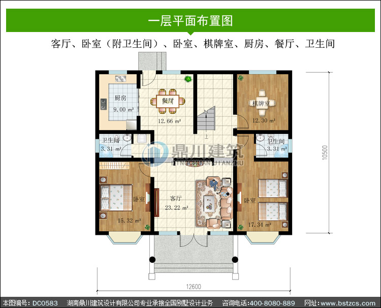 | 一 層: | 客廳、臥室(附衛(wèi)生間)、臥室、棋牌室、廚房、餐廳、衛(wèi)生間 | |||