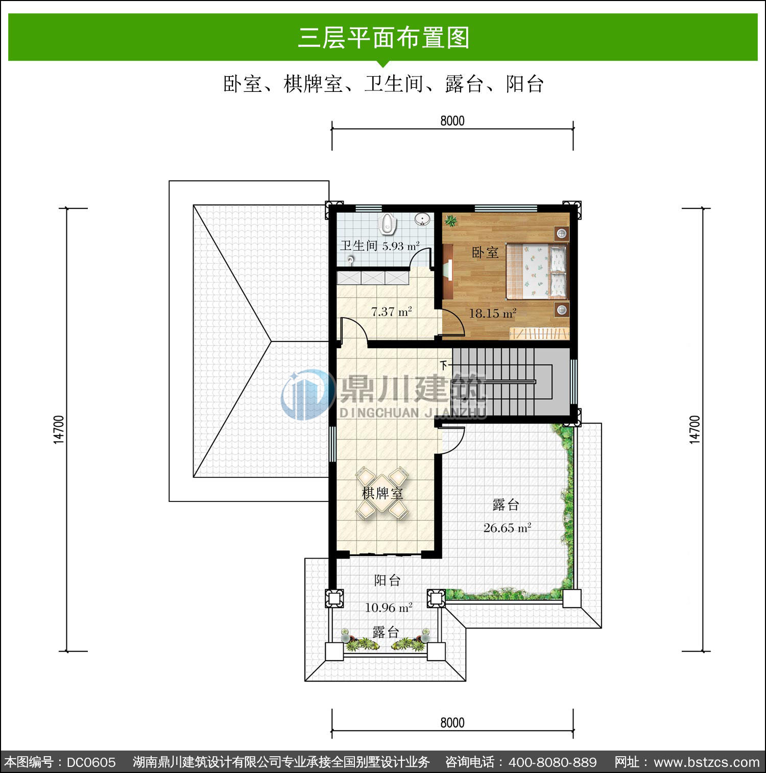 | 三 層: | 臥室、棋牌室、衛(wèi)生間、露臺(tái)、陽(yáng)臺(tái) | |||