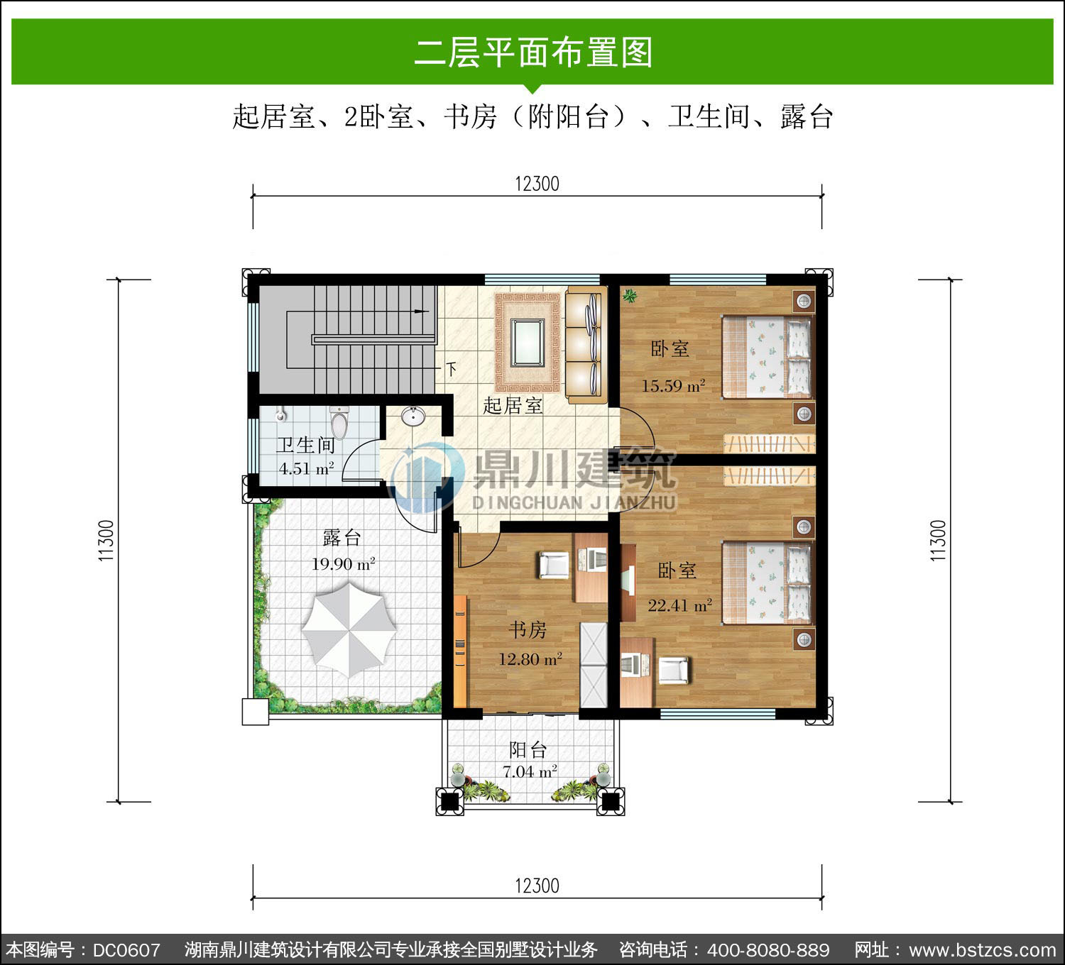 | 二 層: | 起居室、2臥室、書房(附陽臺(tái))、衛(wèi)生間、露臺(tái) | |||