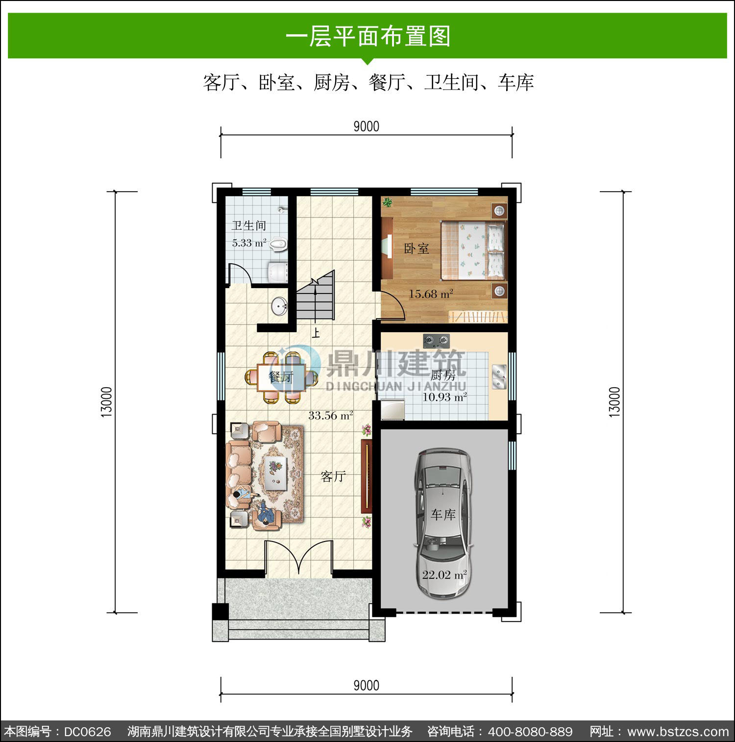 | 一 層: | 客廳、臥室、廚房、餐廳、衛(wèi)生間、車庫(kù) | |||
