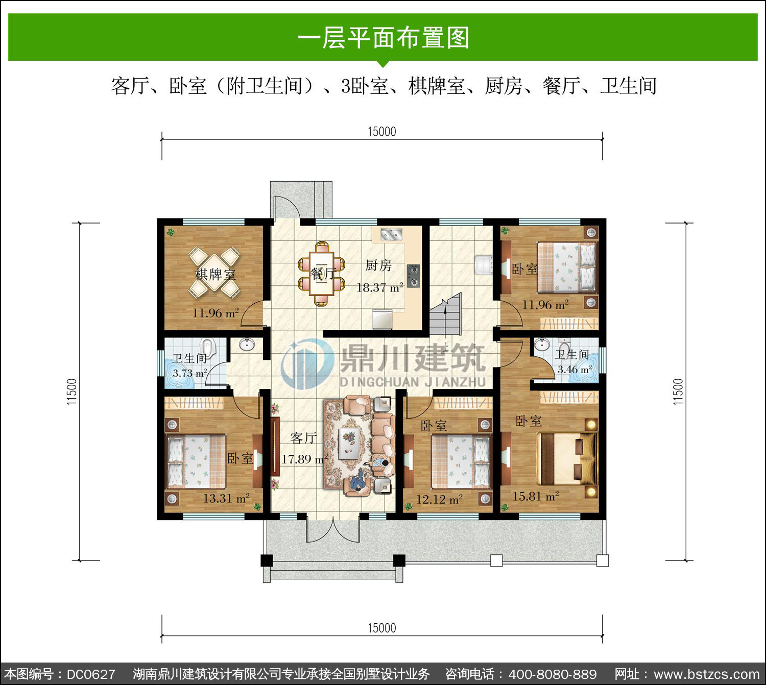 | 一 層: | 客廳、臥室(附衛(wèi)生間)、3臥室、棋牌室、廚房、餐廳、衛(wèi)生間 | |||