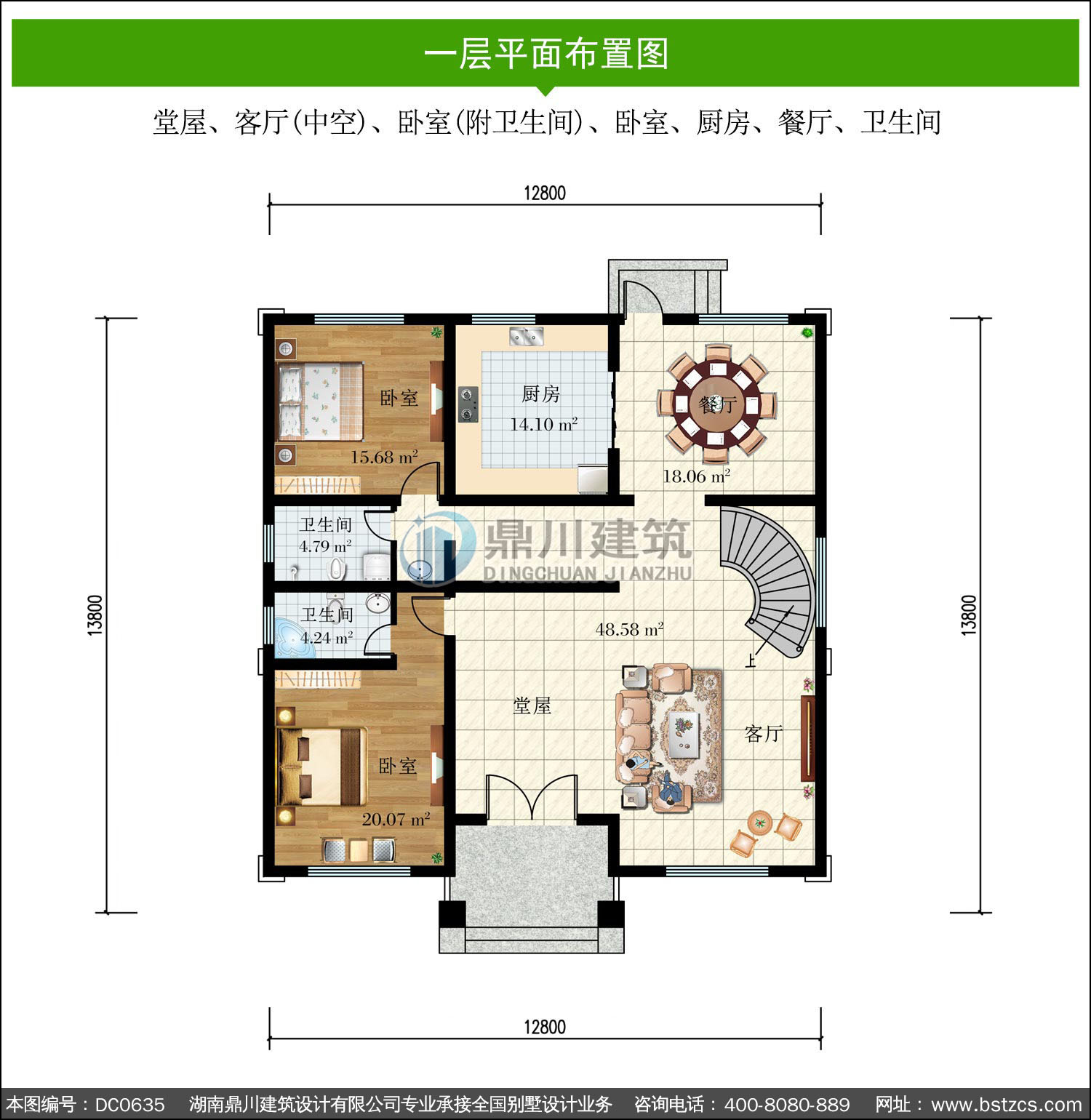 一 層: 堂屋、客廳(中空)、臥室(附衛(wèi)生間)、臥室、廚房、餐廳、衛(wèi)生間