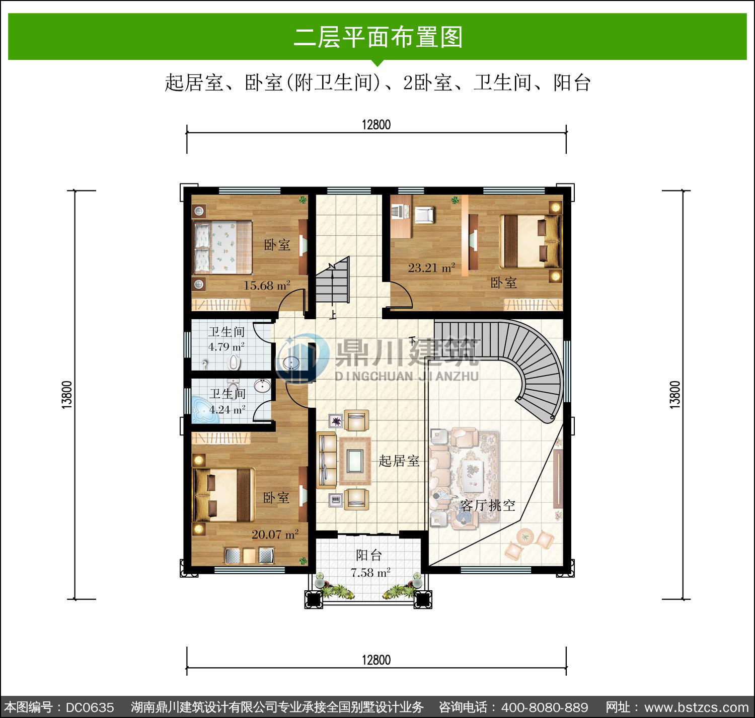 二 層: 起居室、臥室(附衛(wèi)生間)、2臥室、衛(wèi)生間、陽臺