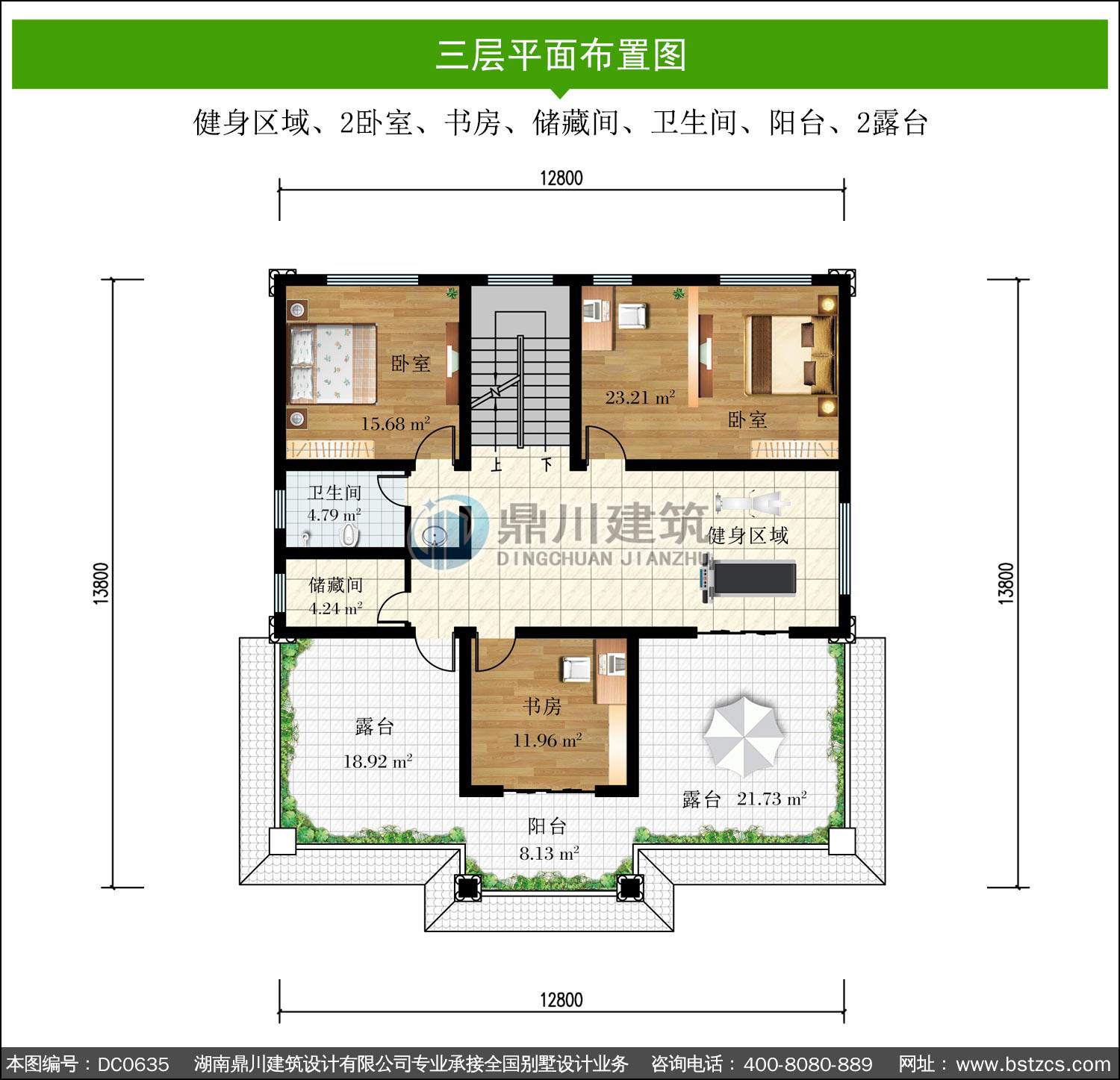 三 層: 健身區(qū)域、2臥室、書房、儲藏間、衛(wèi)生間、陽臺、2露臺