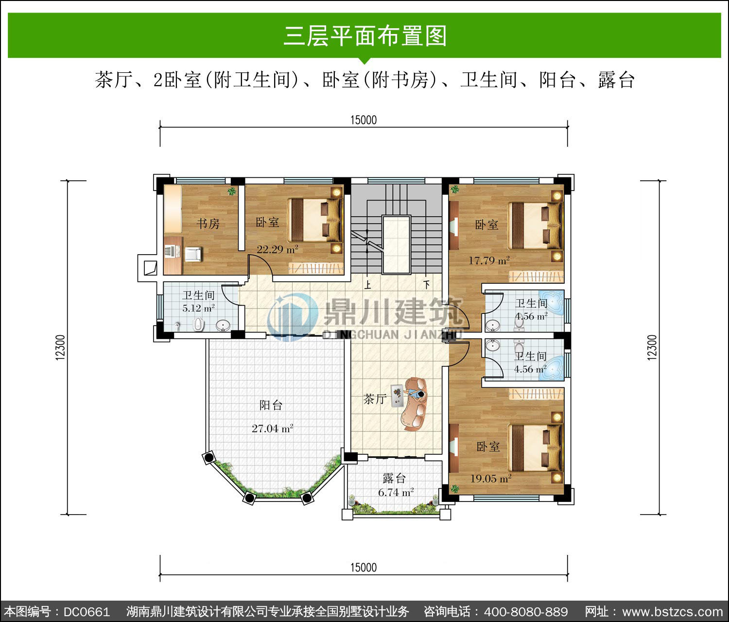 | 三 層: | 茶廳、2臥室(附衛(wèi)生間)、臥室(附書房)、衛(wèi)生間、陽臺、露臺 | |||