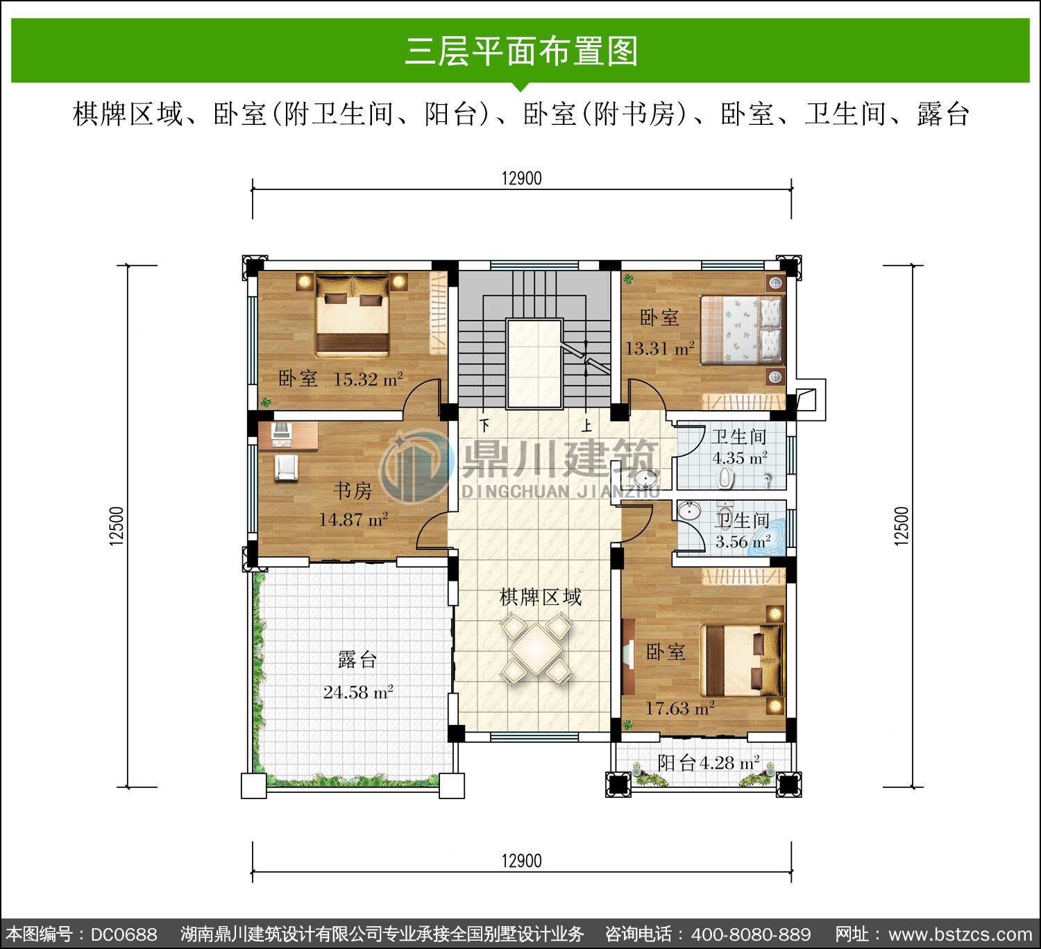| 三 層: | 棋牌區(qū)域、臥室(附衛(wèi)生間、陽(yáng)臺(tái))、臥室(附書(shū)房)、臥室、衛(wèi)生間、露臺(tái) | |||
