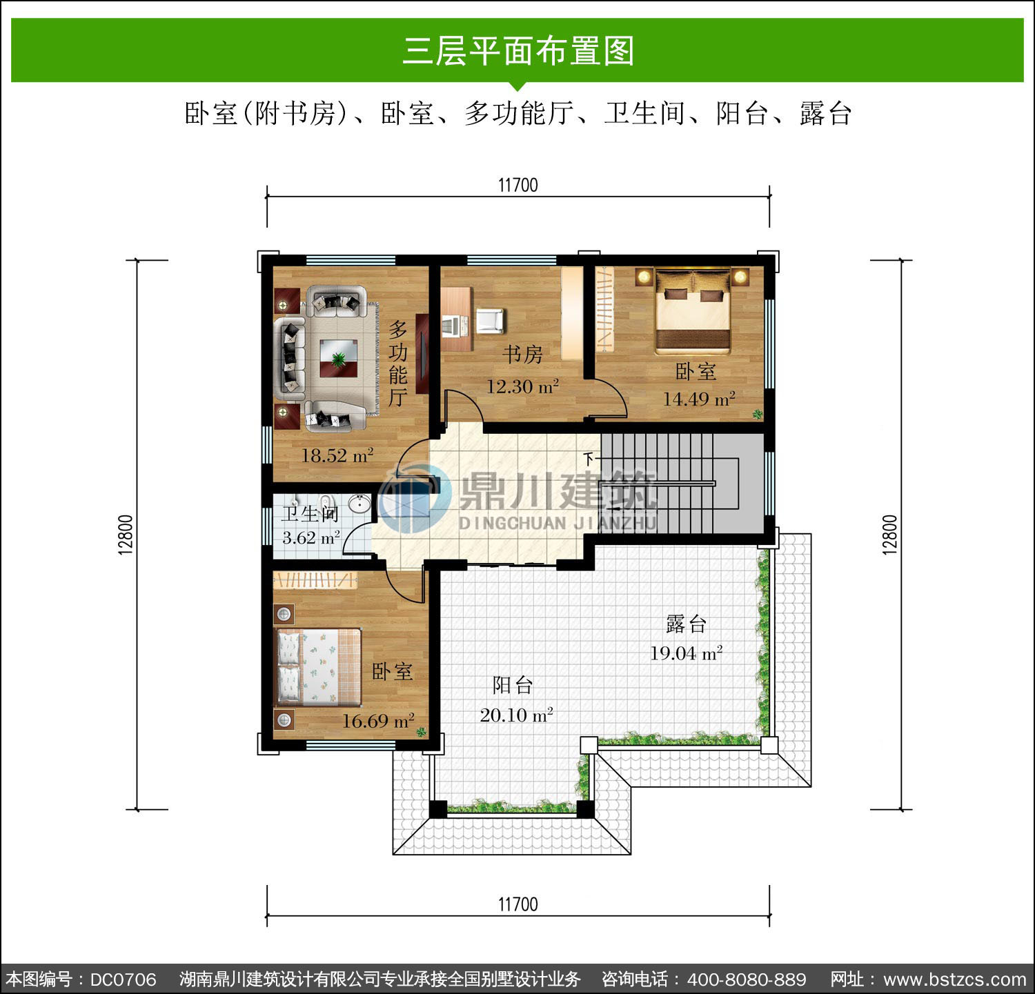 | 三 層: | 臥室(附書房)、臥室、多功能廳、衛(wèi)生間、陽臺、露臺 | |||