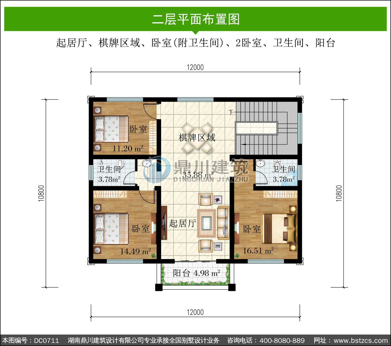 | 二 層: | 起居廳、棋牌區(qū)域、臥室(附衛(wèi)生間)、2臥室、衛(wèi)生間、陽臺 | |||