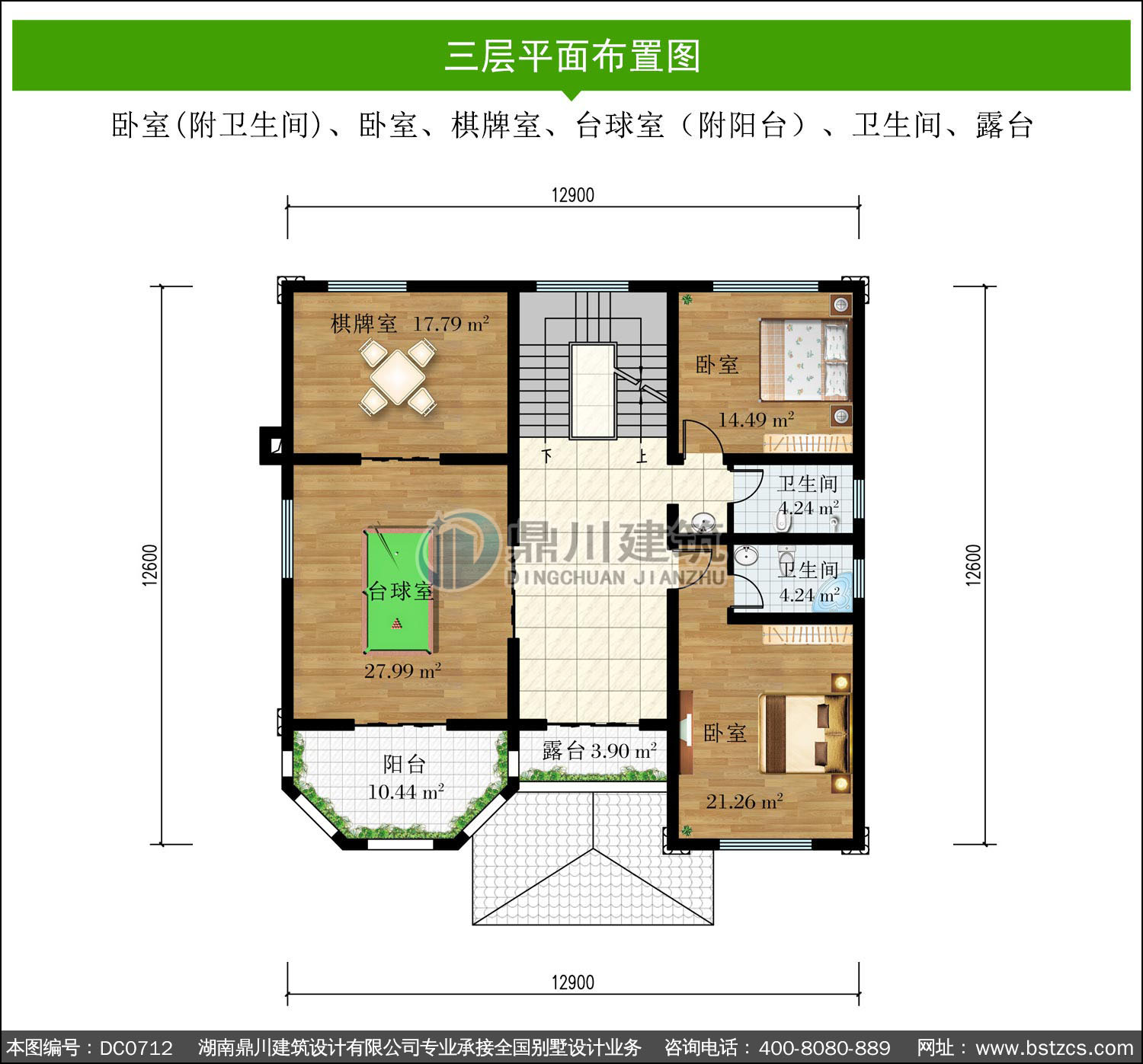 三 層: 臥室(附衛(wèi)生間)、臥室、棋牌室、臺球室(附陽臺)、衛(wèi)生間、露臺