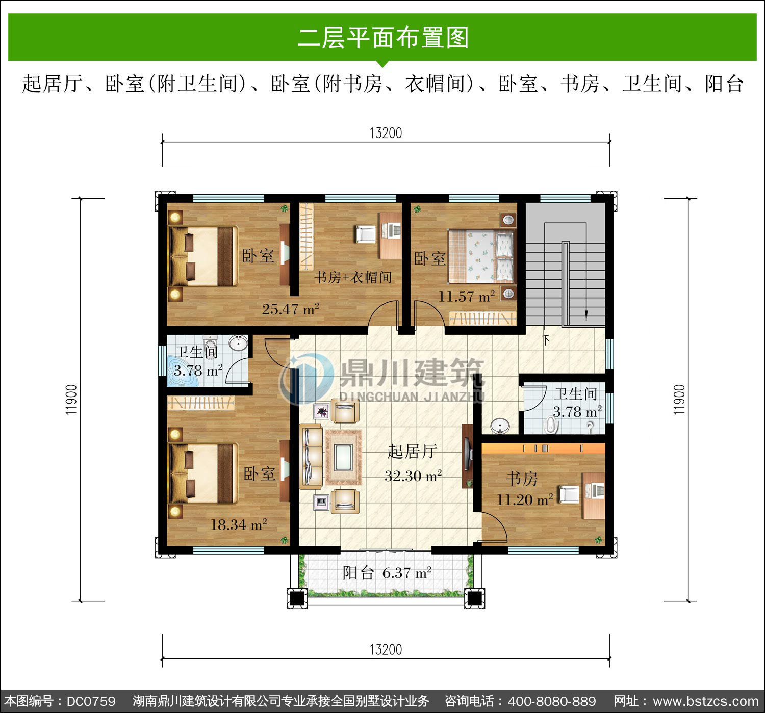 二 層: 起居廳、臥室(附衛(wèi)生間)、臥室(附書(shū)房、衣帽間)、臥室、書(shū)房、衛(wèi)生間、陽(yáng)臺(tái)