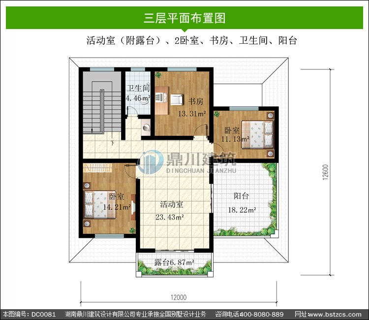 | 三 層: | 活動(dòng)室(附露臺(tái))、2臥室、書房、衛(wèi)生間、陽臺(tái) | |||