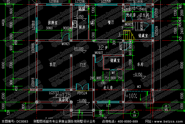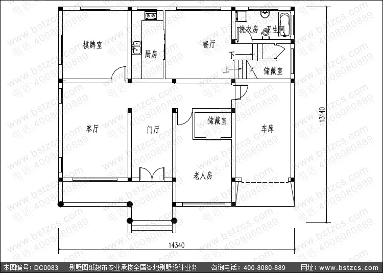 | 一 層: | 門廳、客廳、老人房(附儲藏室)、棋牌室、廚房、餐廳、儲藏室、衛(wèi)生間、車庫 | |||