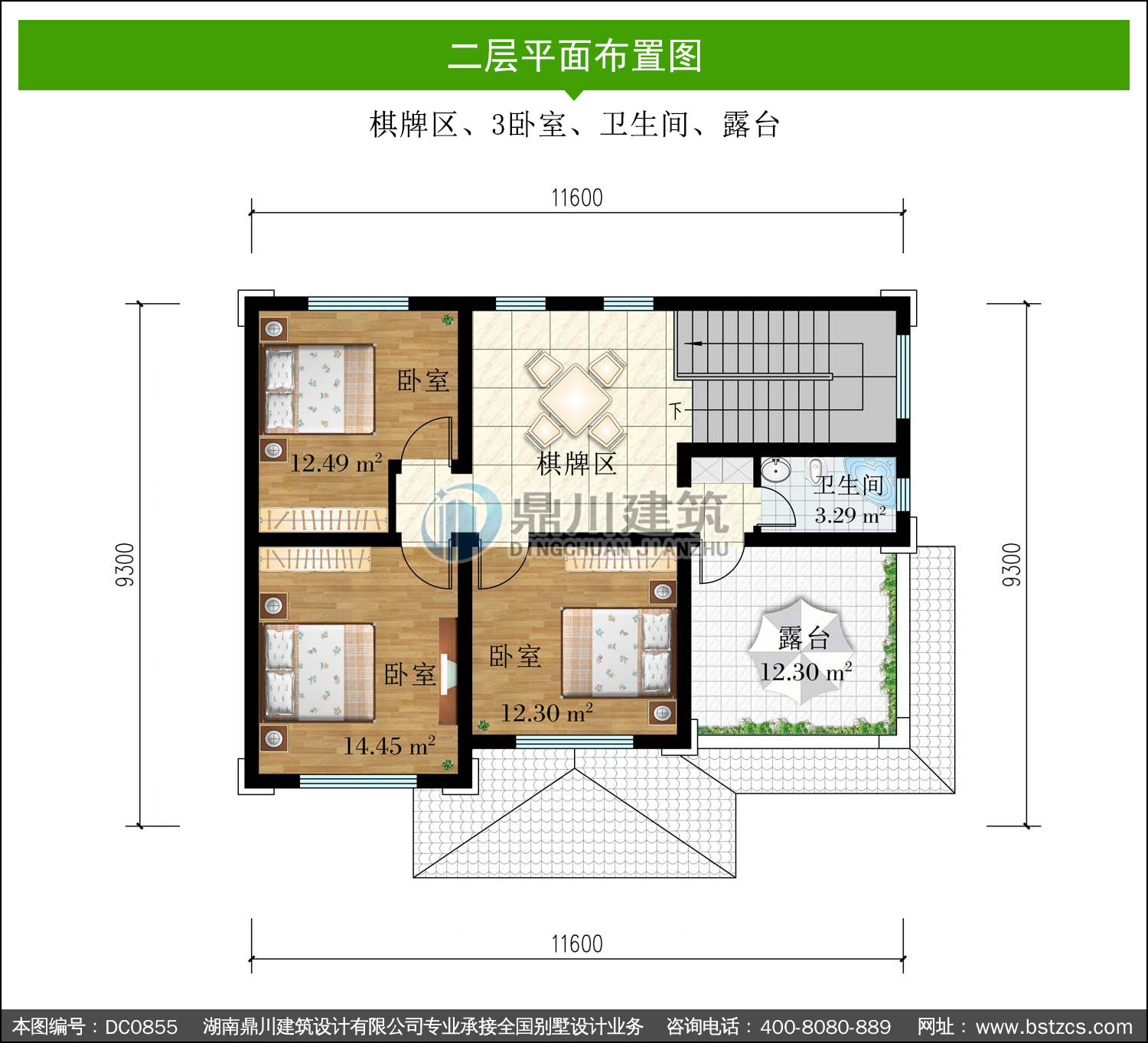 | 二 層: | 棋牌區(qū)、3臥室、衛(wèi)生間、露臺 | |||