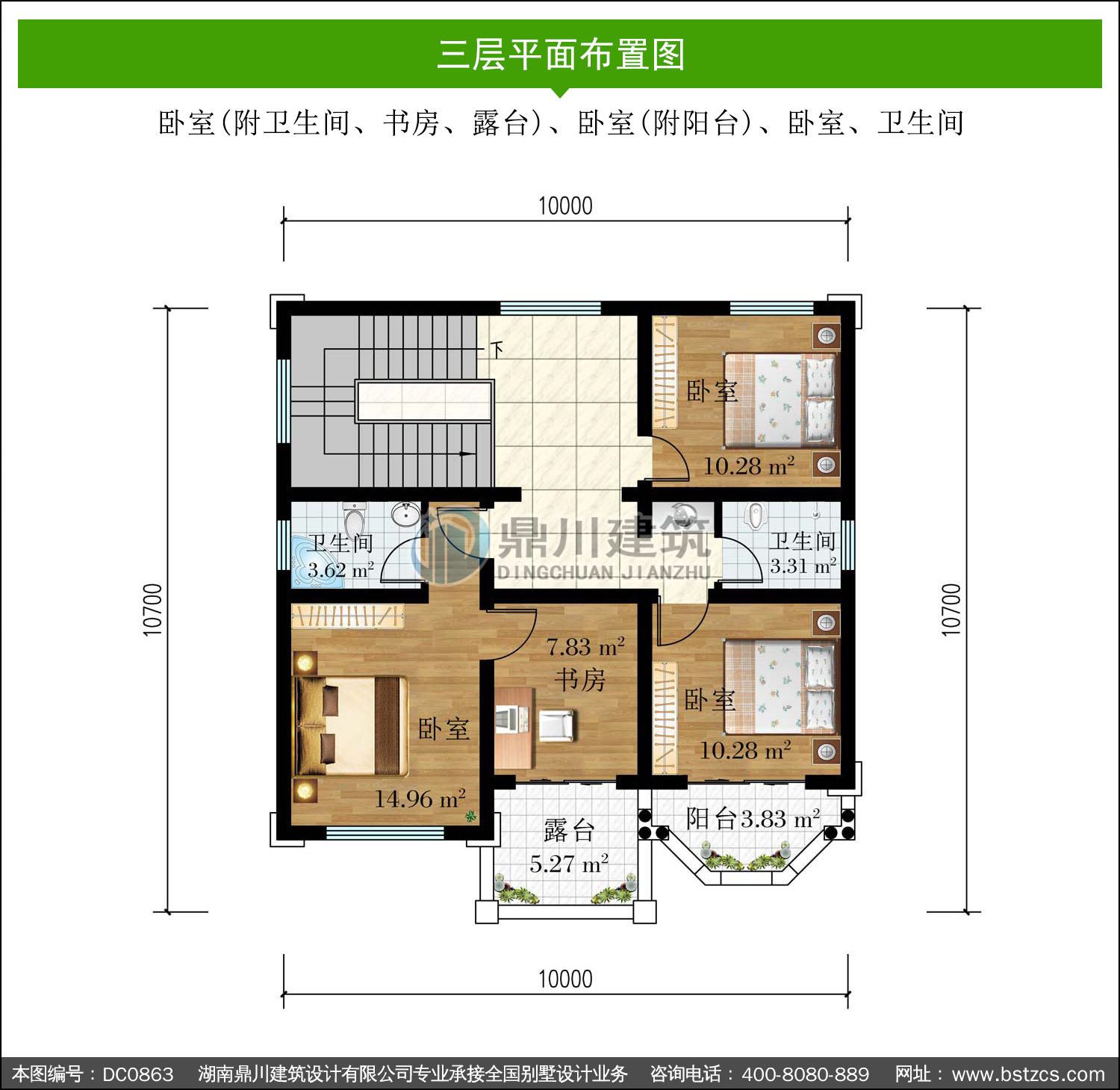 | 三 層: | 臥室(附衛(wèi)生間、書房、露臺)、臥室(附陽臺)、臥室、衛(wèi)生間 | |||