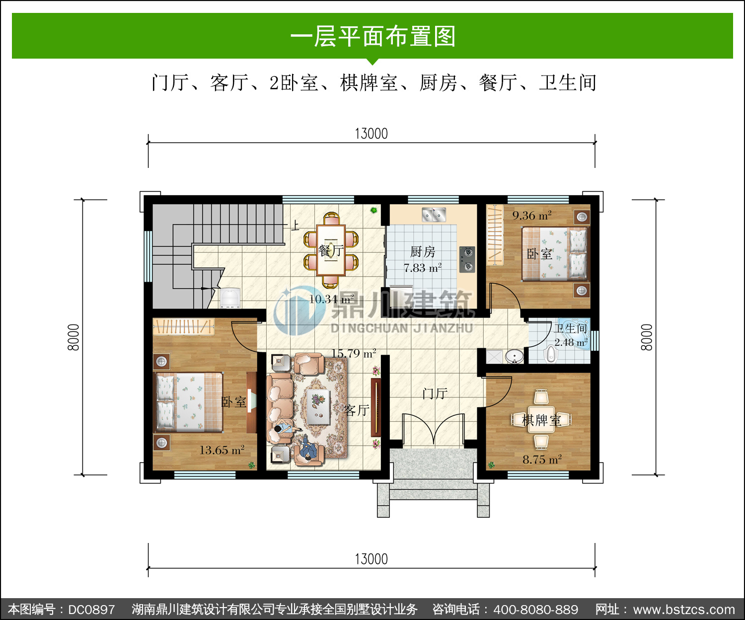 一 層: 門廳、客廳、2臥室、棋牌室、廚房、餐廳、衛(wèi)生間