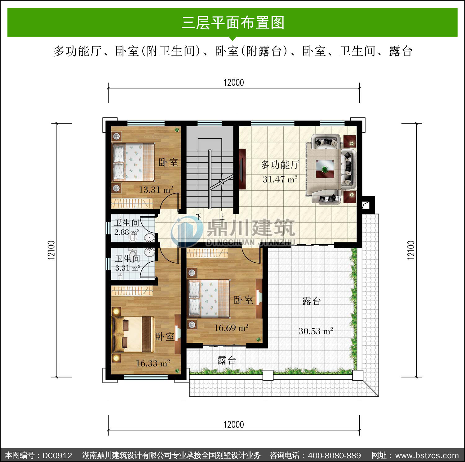 | 三 層: | 多功能廳、臥室(附衛(wèi)生間)、臥室(附露臺(tái))、臥室、衛(wèi)生間、露臺(tái) | |||