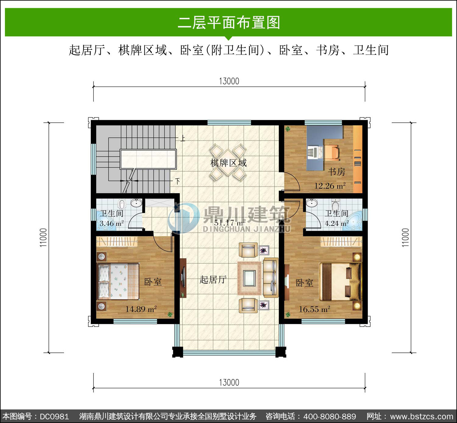 二 層: 起居廳、棋牌區(qū)域、臥室(附衛(wèi)生間)、臥室、書(shū)房、衛(wèi)生間